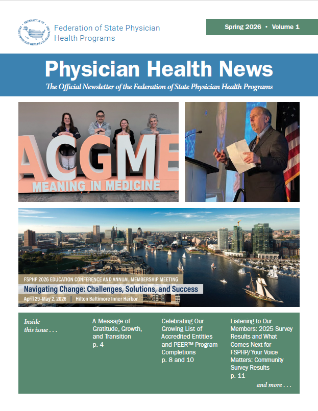 Welcome to the 29th edition, Volume 2 of Physician Health News. Physician Health News is the official newsletter of the Federation of State Physician Health Programs (FSPHP) and is published by the FSPHP.